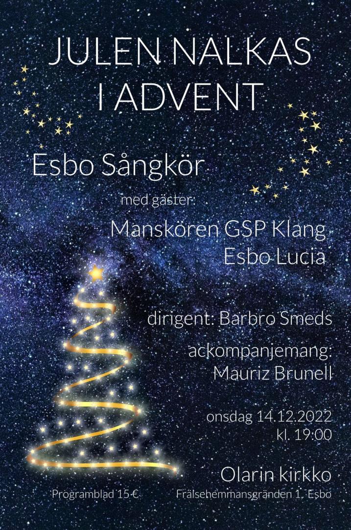Onsdagen den 14 december klockan 19 ger vi vår traditionella julkonsert, den här gången i Olarin kirkko (den större av de två kyrksalarna i Olars), där vi har glädjen att dela scenen med både manskören GSP Klang och Esbo Lucia med tärnor. Fritt inträde, programblad 15 €, frivillig luciainsamling vid utgången.